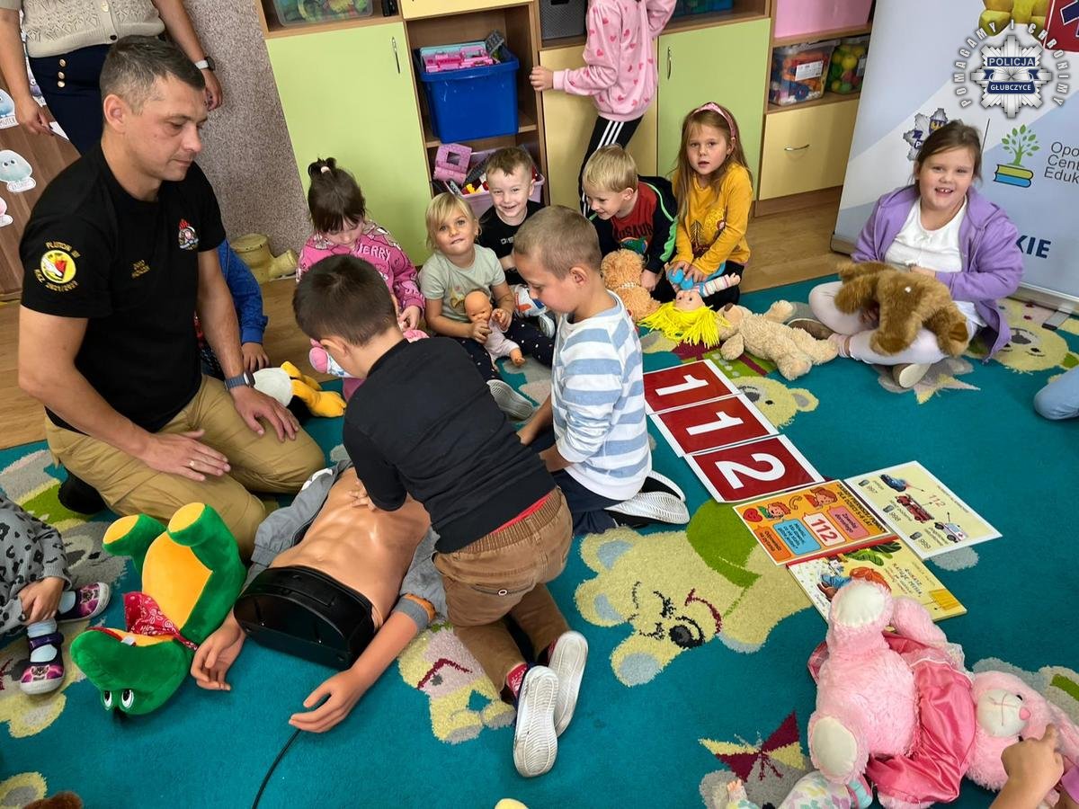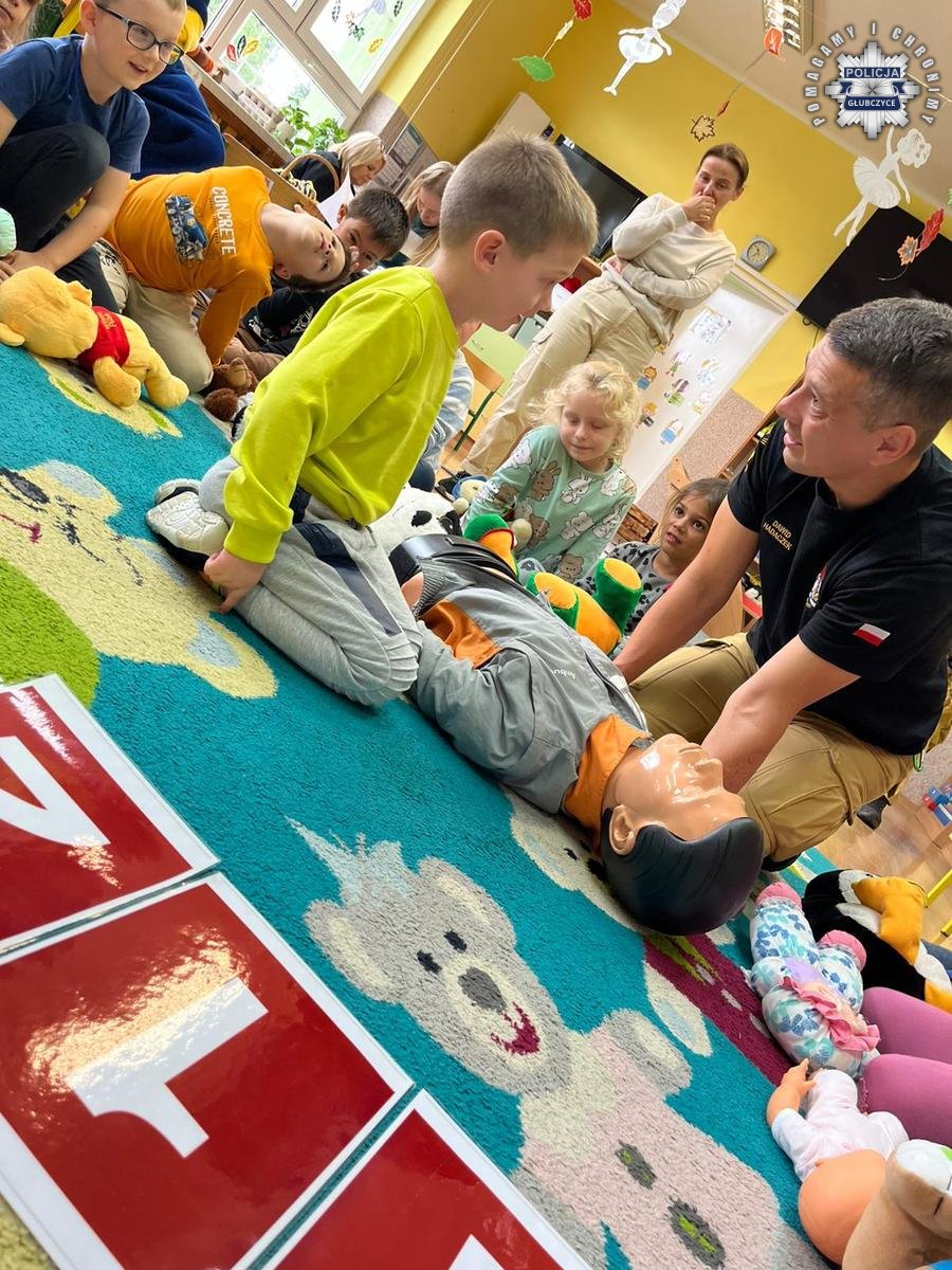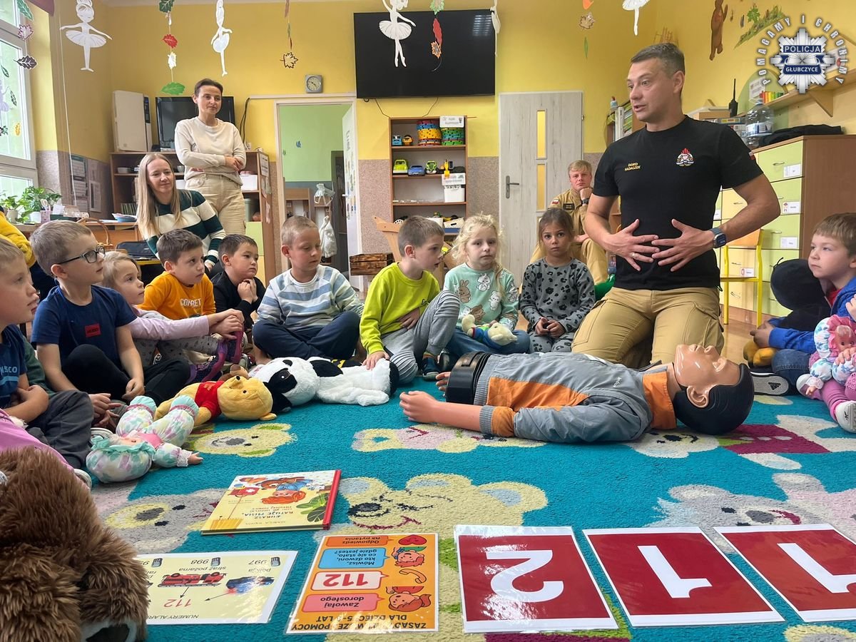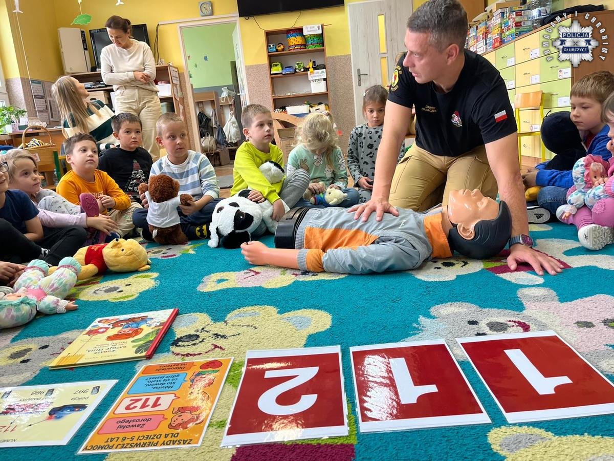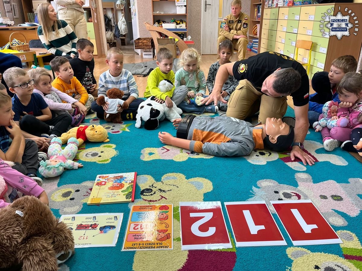 Zanim rozpoczęła się część edukacyjna, sierż. Nicola Rzeczkowska z Komendy Powiatowej Policji w Głubczycach przeczytała bajkę o dzielnym Jasiu, który uratował swoją wychowawczynię dzwoniąc pod numer alarmowy 112. Następnie asp. Dawid Hadaczek poprowadził zajęcia z udzielania pierwszej pomocy. Dzielne i zaangażowane przedszkolaki świetnie poradziły sobie z zadaniem – wykazały się opanowaniem, dobrą pamięcią i umiejętnością jasnego przekazania informacji. To ważna lekcja, która może kiedyś uratować życie.