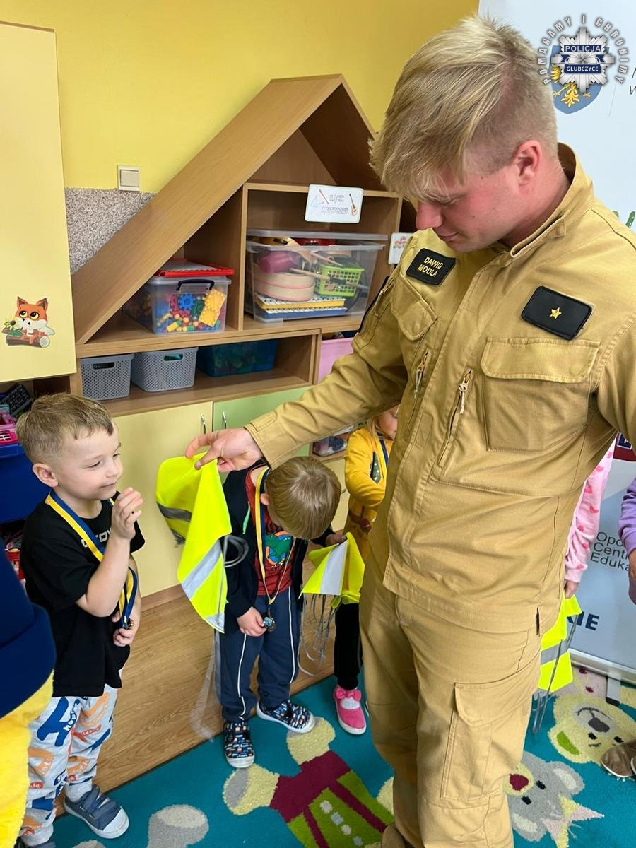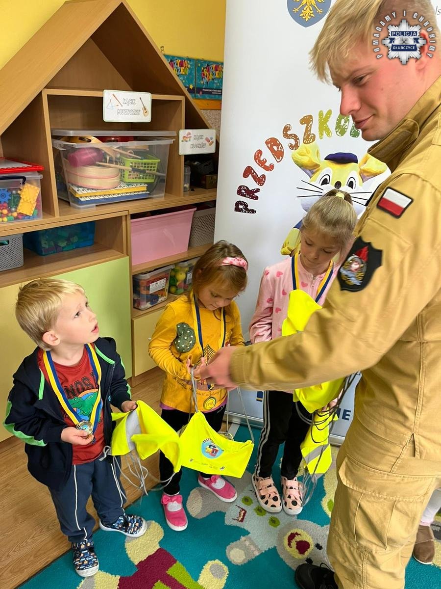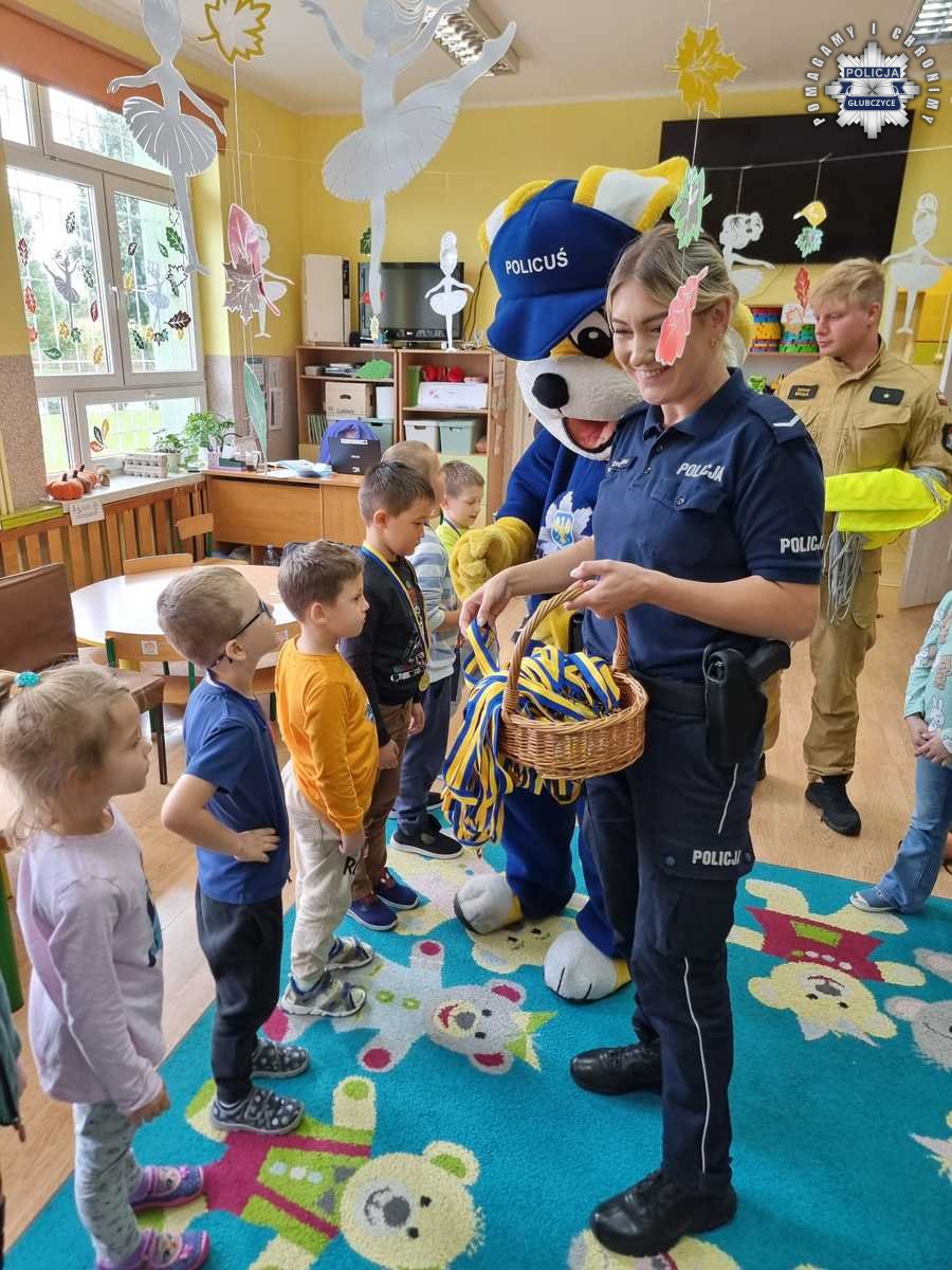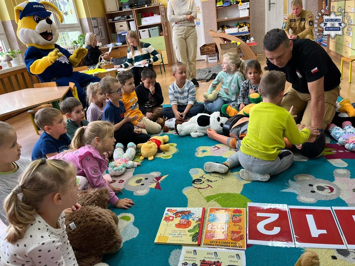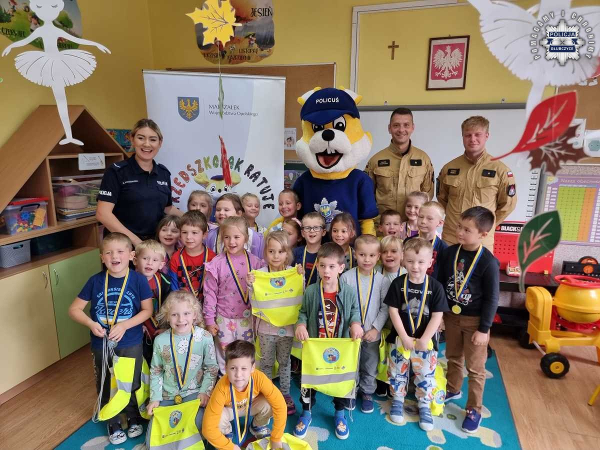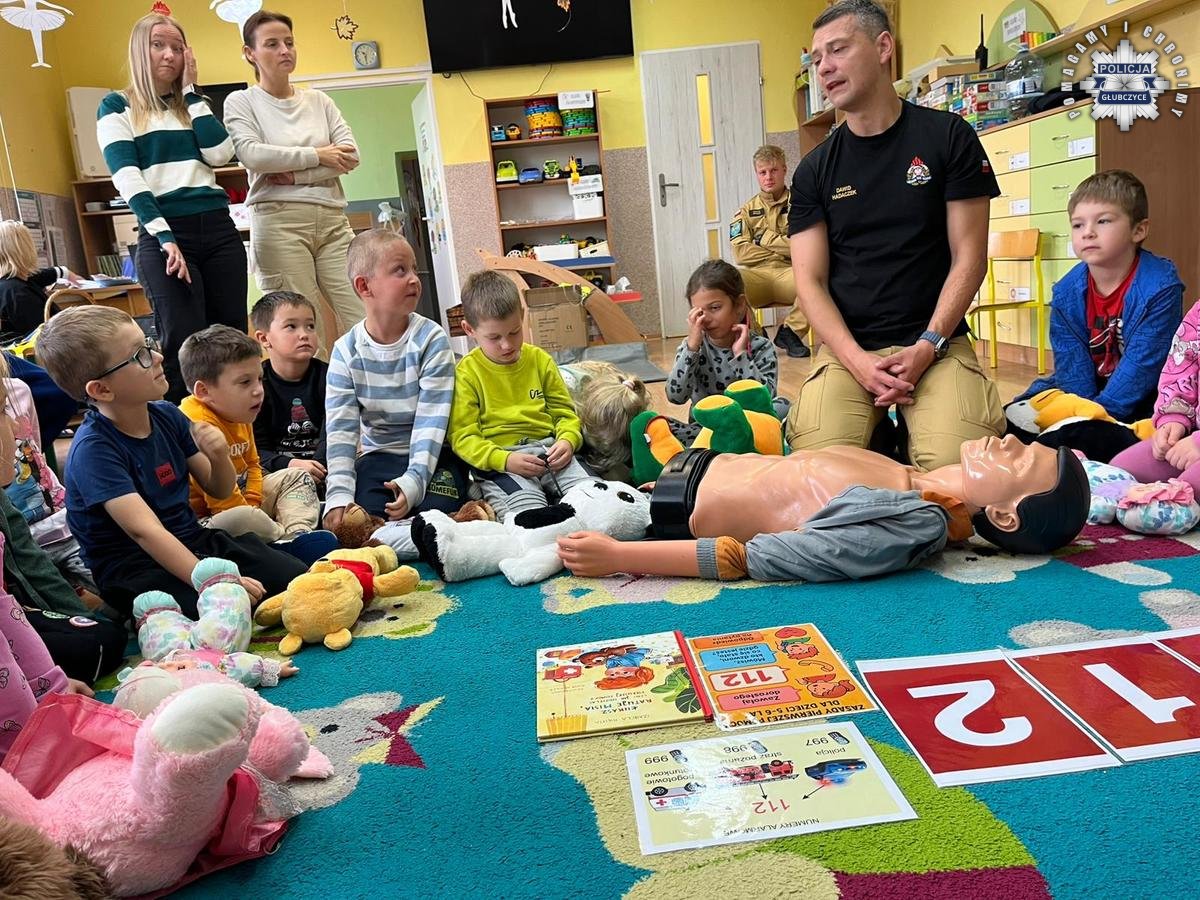 Zanim rozpoczęła się część edukacyjna, sierż. Nicola Rzeczkowska z Komendy Powiatowej Policji w Głubczycach przeczytała bajkę o dzielnym Jasiu, który uratował swoją wychowawczynię dzwoniąc pod numer alarmowy 112. Następnie asp. Dawid Hadaczek poprowadził zajęcia z udzielania pierwszej pomocy. Dzielne i zaangażowane przedszkolaki świetnie poradziły sobie z zadaniem – wykazały się opanowaniem, dobrą pamięcią i umiejętnością jasnego przekazania informacji. To ważna lekcja, która może kiedyś uratować życie.