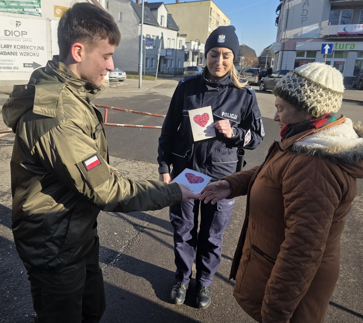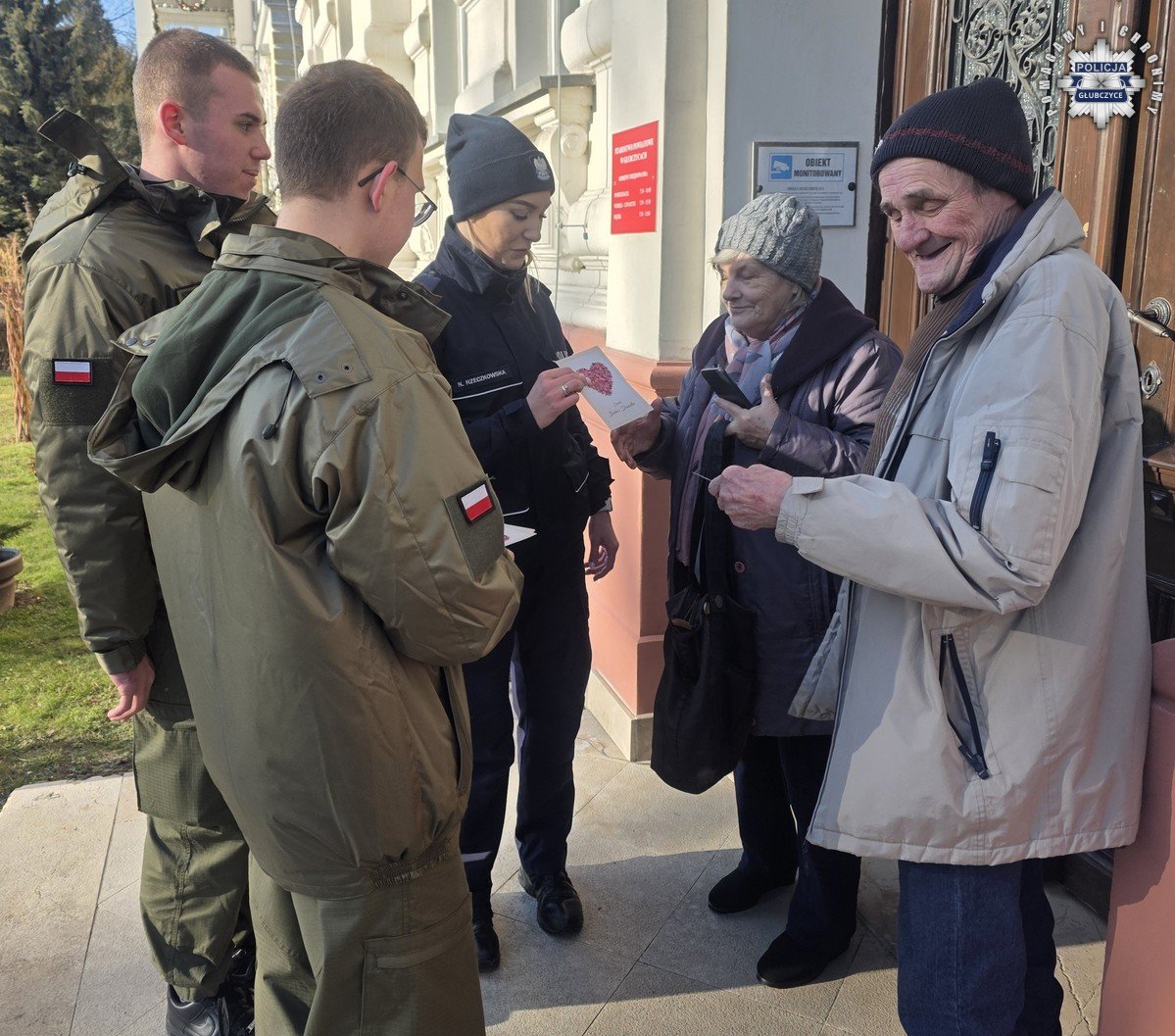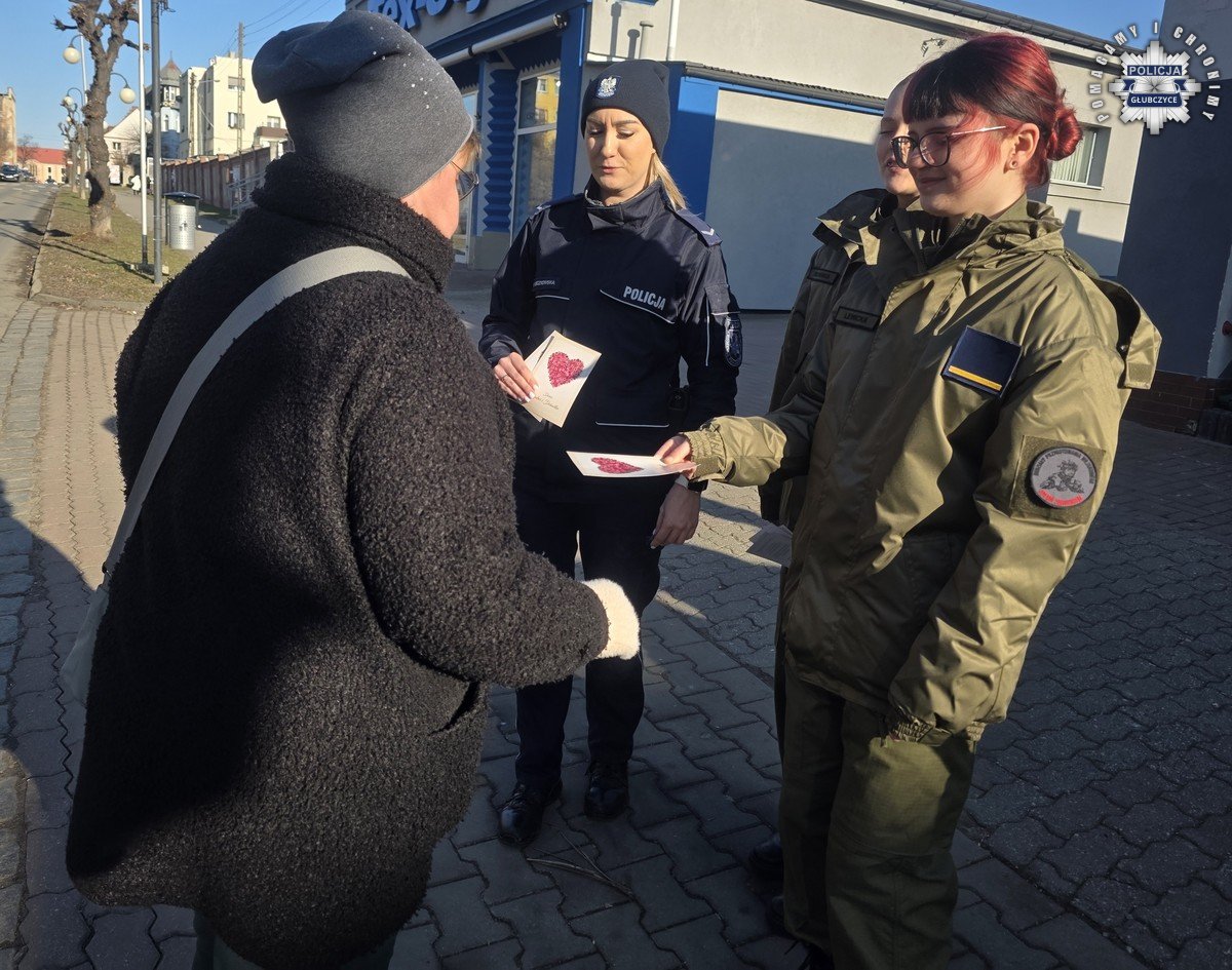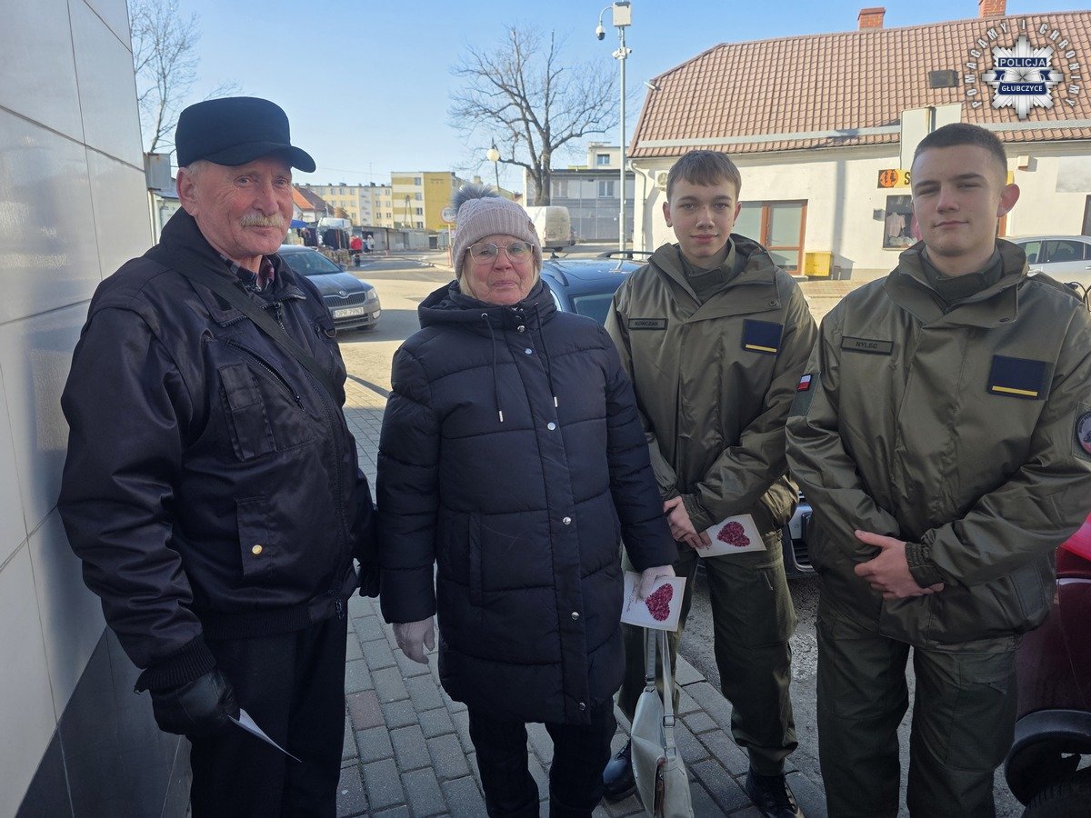 Policjanci z Głubczyc wspólnie z uczniami klasy mundurowej głubczyckiego Liceum Ogólnokształcącego przeprowadzili działania profilaktyczne w ramach projektu „Opolski Bezpieczny Senior”. Akcja została przeprowadzona w centrum Głubczyc, gdzie funkcjonariusze wspólnie z uczniami wręczali mieszkańcom kartki z życzeniami z okazji Dnia Babci i Dnia Dziadka.