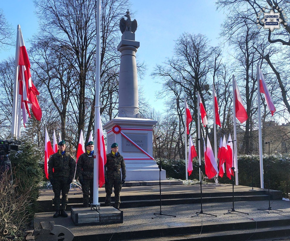 Nad bezpieczeństwem uczestników ceremonii czuwali policjanci z Komendy Powiatowej Policji w Głubczycach oraz jednostek wsparcia. Funkcjonariusze zabezpieczyli teren uroczystości, dbali o porządek publiczny oraz płynność ruchu drogowego w rejonie parku miejskiego, by uroczystość odsłonięcia „Kolumny Wolności” przebiegła w spokojnej i bezpiecznej atmosferze.